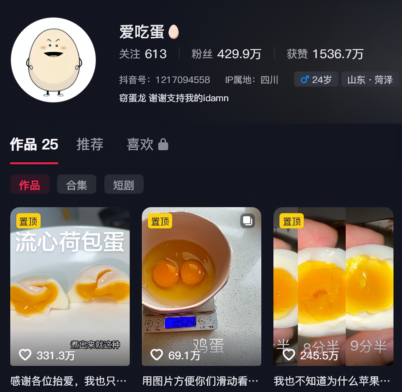 这位博主名为爱吃蛋,网友此前调侃他为 “ 蛋神 ” 。