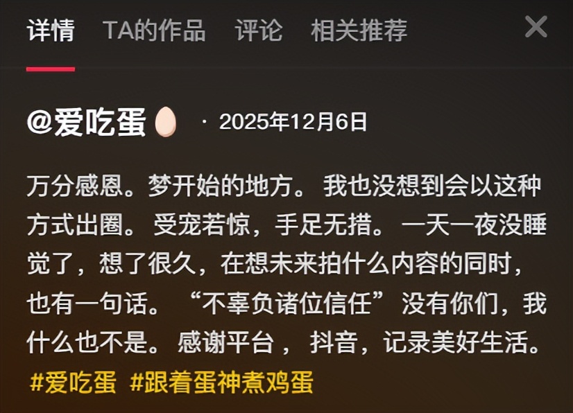 这种信任裂痕迅速蔓延,将他往后的一举一动都推向了舆论的审判台,爱吃蛋此前的发言都被翻出,被审视,成为一道道回击他自己的回旋镖。